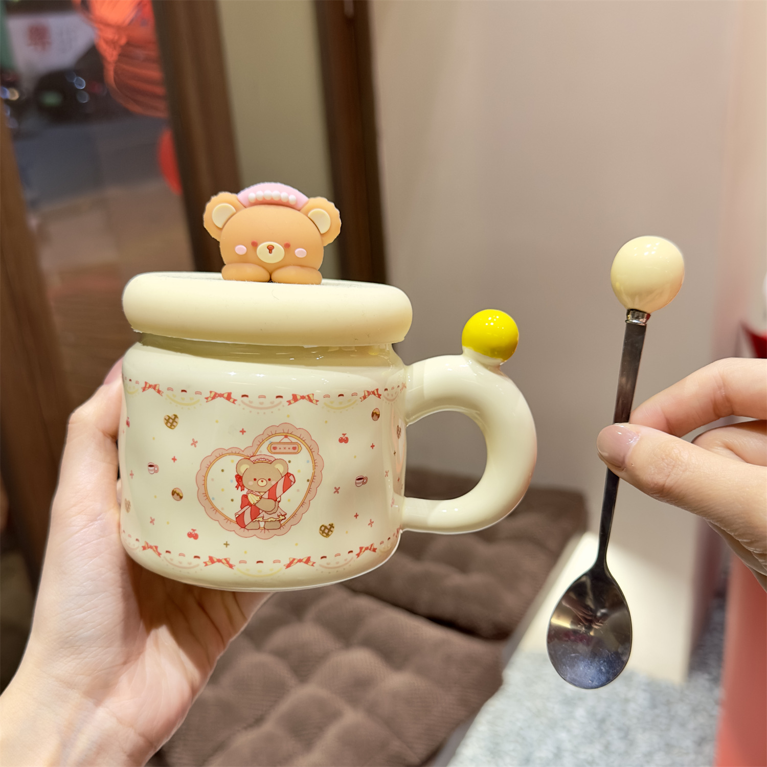 This ceramic mug comes with a cute bear-shaped lid and a matching spoon. It features adorable bear graphics and delicate patterns. It is available in multiple colors for you to choose from, combining charm and functionality, making it a delightful choice for your daily coffee or tea moments.